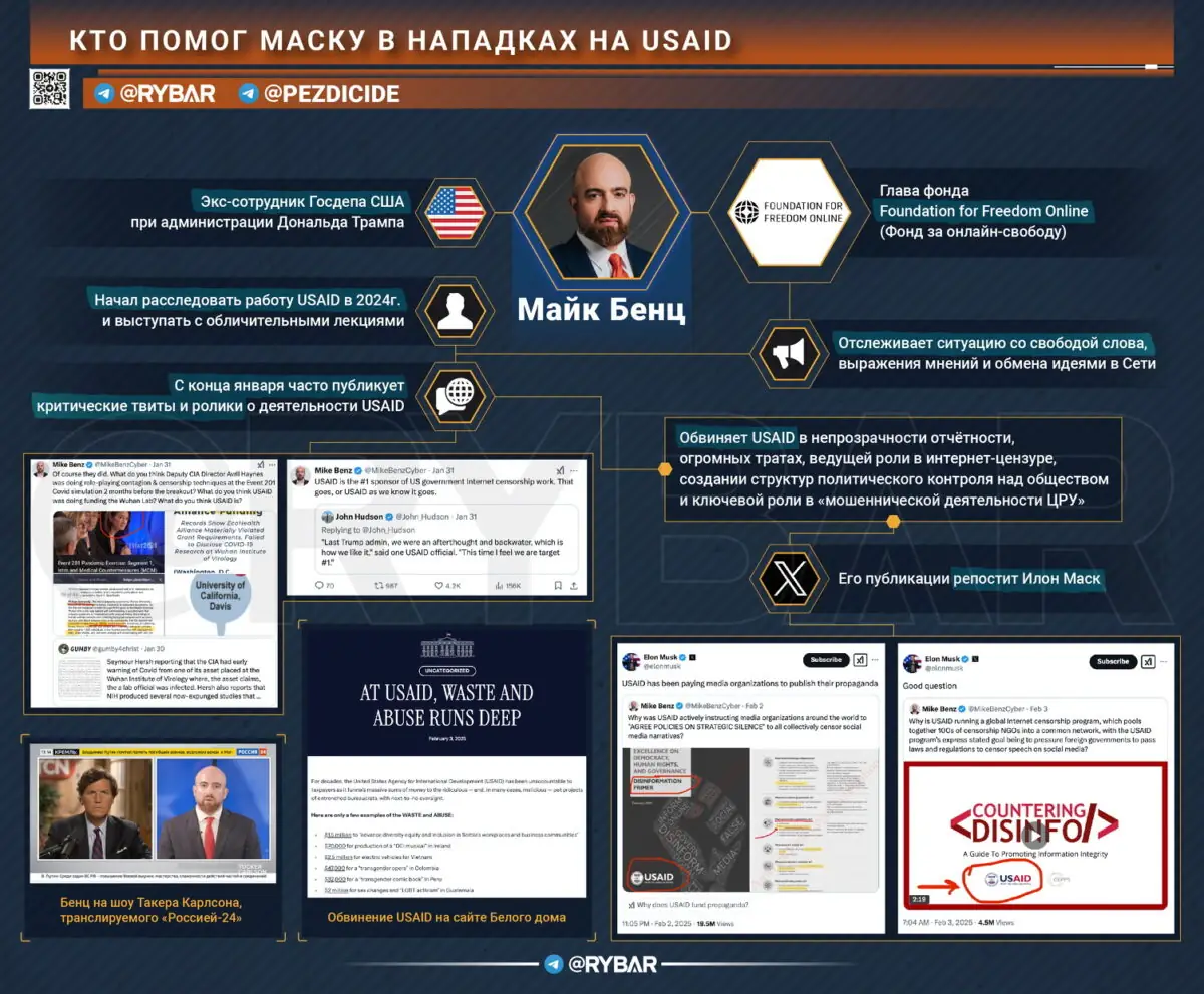 В своём стремлении потопить агентство Маск особенно часто репостил заявления и ролики некоего Майка Бенца — бывшего сотрудника Госдепартамента при администрации Трампа, а ныне главу фонда Foundation for Freedom Online (Фонд за онлайн-свободу, FFO).