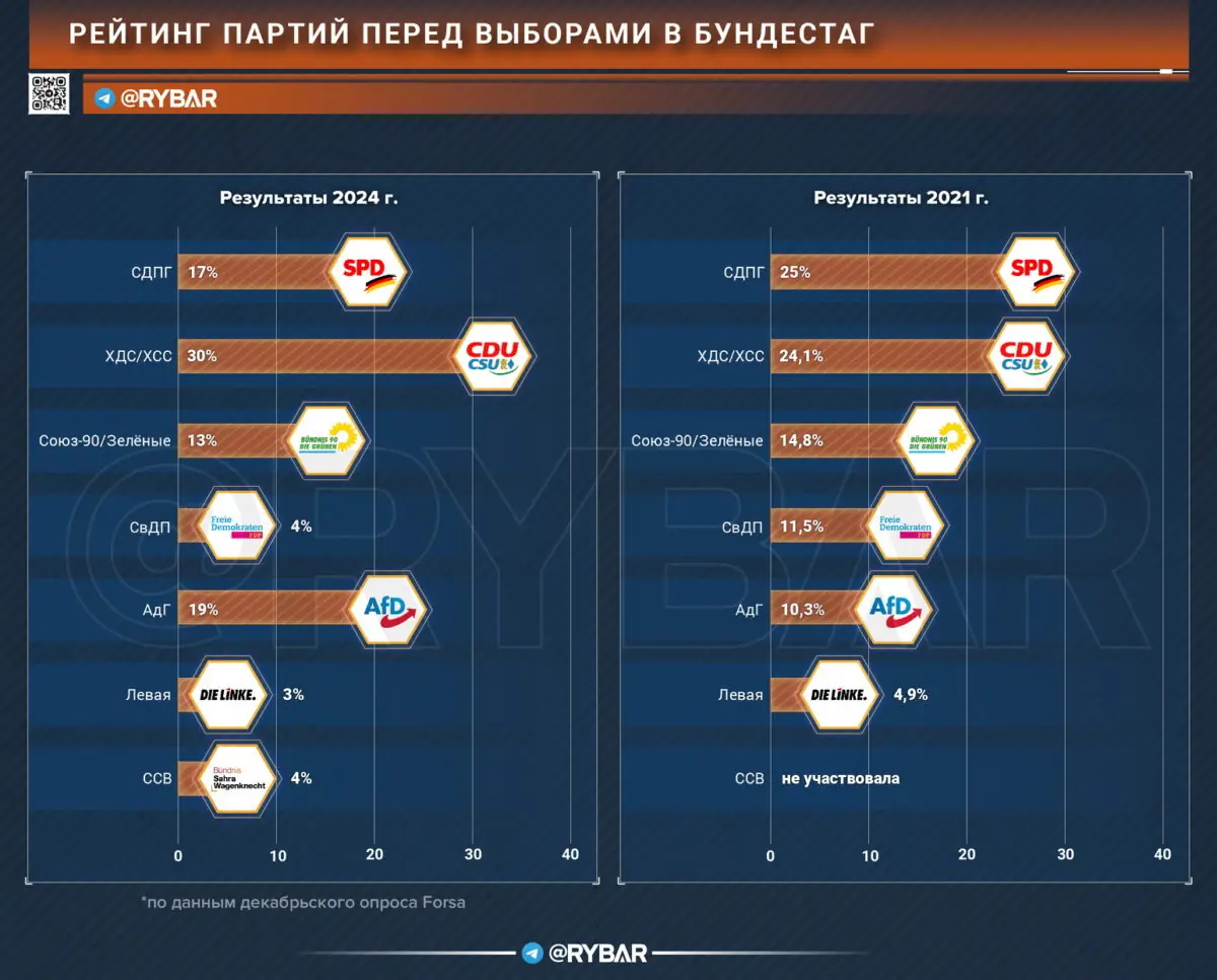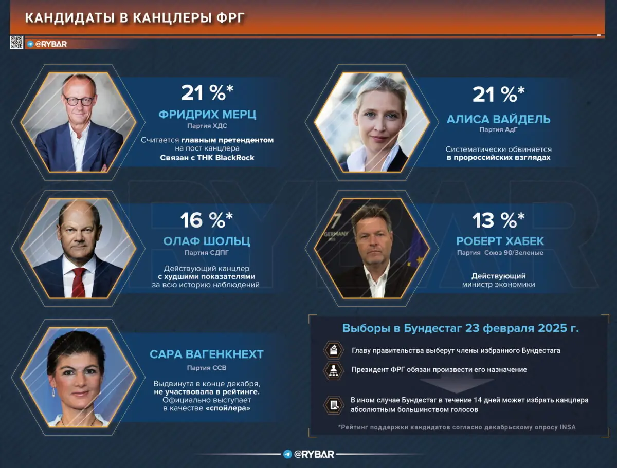 Политический кризис в Германии достиг верхней точки, в результате чего Бундестаг 16 декабря вынес вотум недоверия канцлеру Олафу Шольцу и его правительству, что открыло дорогу к проведению внеочередных парламентских выборов 23 февраля 2025 года.