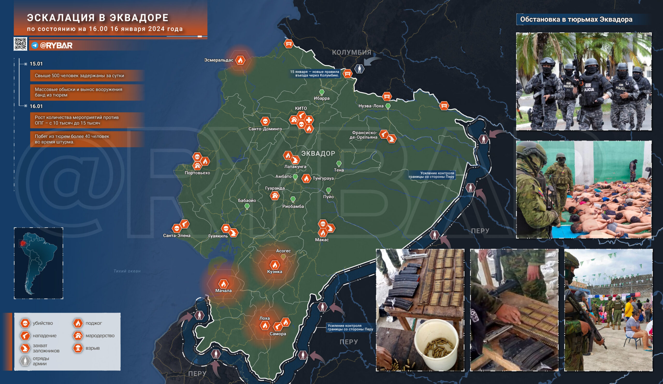 Менее чем за 1,5 суток, силовики Эквадора — согласно официальным данным — ухитрились провести еще пять тысяч оперативно-розыскных мероприятий и арестовать еще чуть более четырехсот человек. При этом власти отрапортовали, что будут проводить необходимые мероприятия постоянно, взяв в пример Сальвадор. В связи с этим вероятно, что режим ЧС и внутреннего вооруженного конфликта может продлиться дольше заявленных 60 дней. Нельзя сказать, что в этом есть что-то необычное (учитывая криминальную статистику), однако теперь свобода действий силового аппарата открыто демонстрируется. Причем с заявкой на то, что чрезвычайные полномочия могут быть сохранены на постоянной основе.