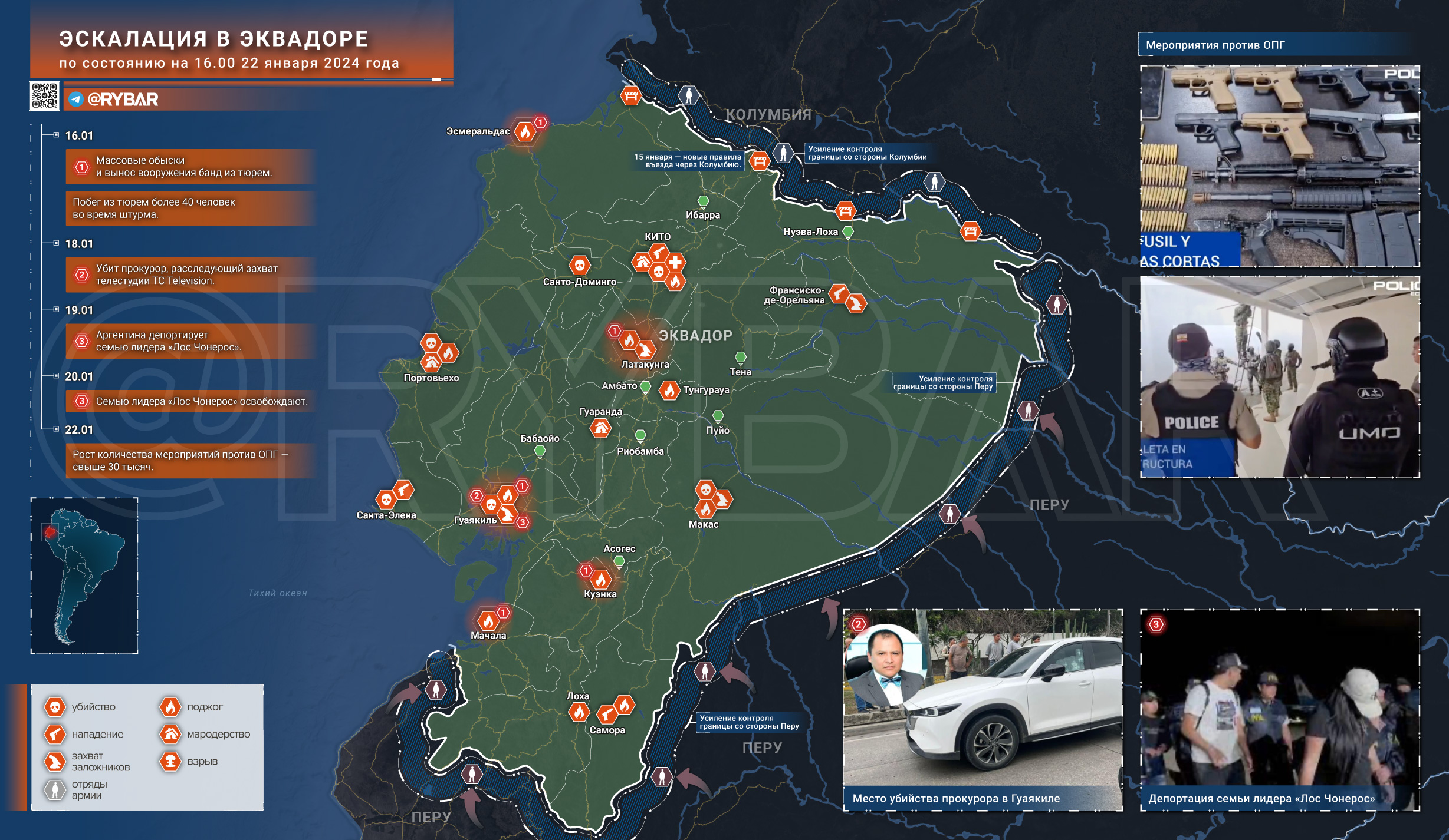 Из наиболее значимых событий — убийство прокурора Сесара Суареса 18 января в Гуаякиле. Суарес занимался расследованием захвата телестудии ТС Television, поэтому с подачи властей Эквадора уже превратился в мученика, павшего в борьбе с криминалитетом. Вместе с тем, прокурор также курировал дела, связанные с коррупцией в силовых структурах и медицинских учреждениях, поэтому вполне мог пасть от рук конкурентов, удачно воспользовавшихся ситуацией.