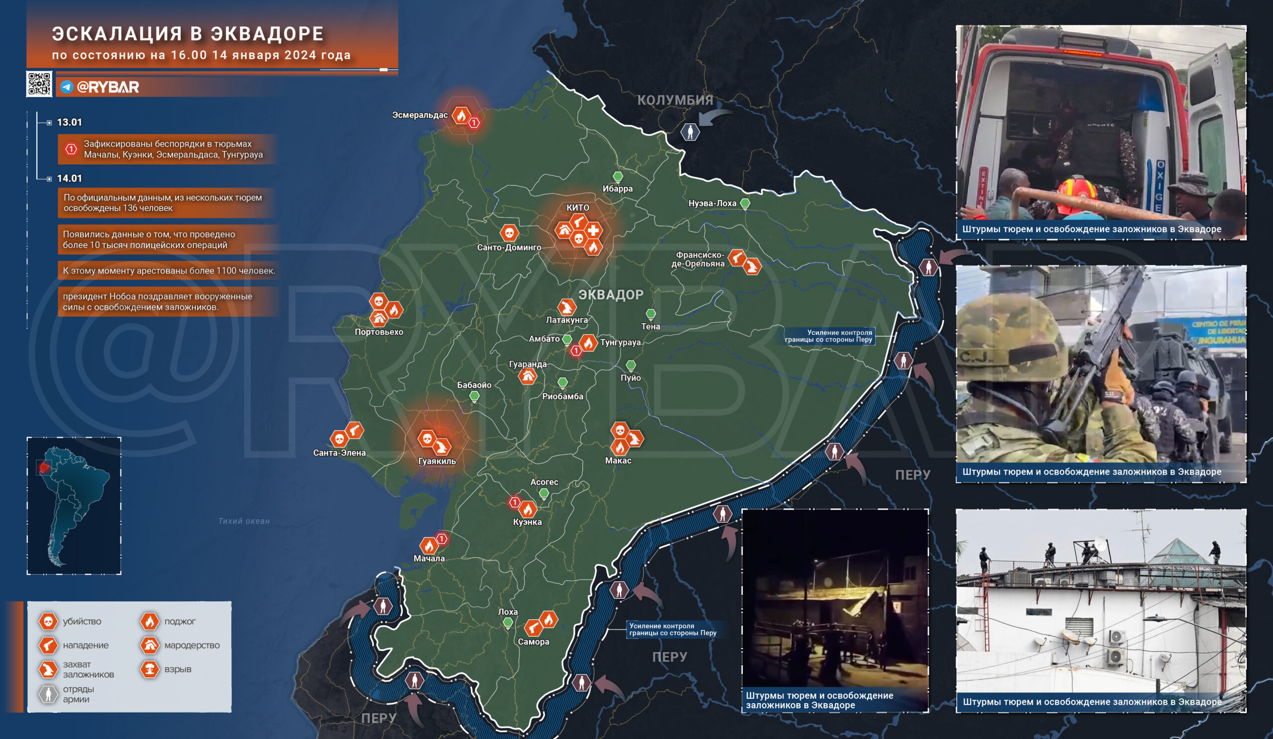 Прошедшие сутки отметились столкновениями между вооруженными силами и бандформированиями, случившимися в тюрьмах. Сразу в нескольких пенитенциарных учреждениях — в Куэнке, Мачале, Эль Оро, Тунгурауа и Эсмеральдасе — произошли тюремные бунты, сопровождающиеся захватом в заложники работников учреждений. Вместе с тем, к настоящему времени власти отчитались об освобождении более 20 человек в Мачале, Тунгурауа и Эсмеральдасе. В последнем это произошло при содействии священников католической церкви, участвующих в переговорах.