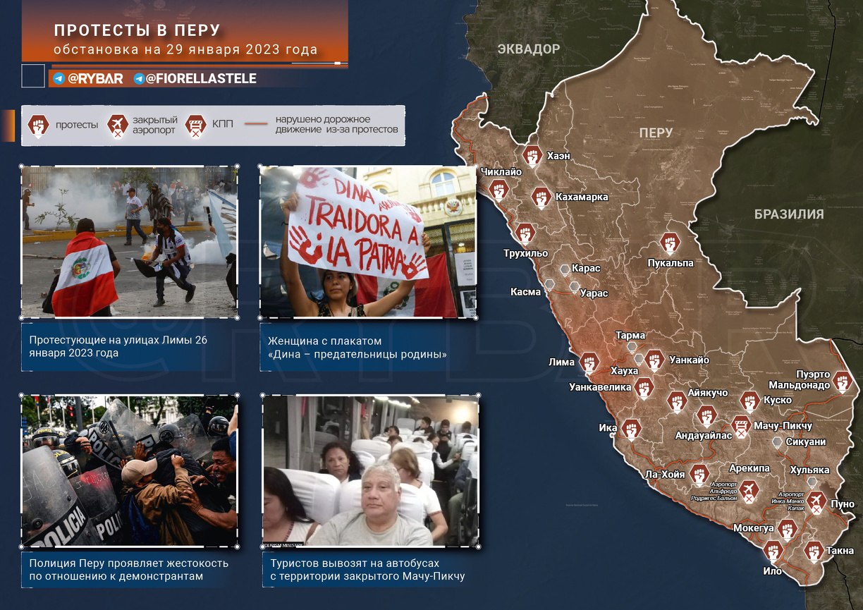 Закрыты аэропорты в Пуно и Арекипе, основные трассы заблокированы демонстрантами.