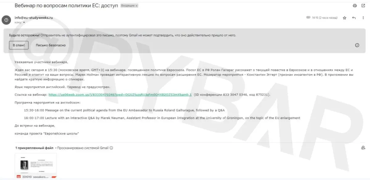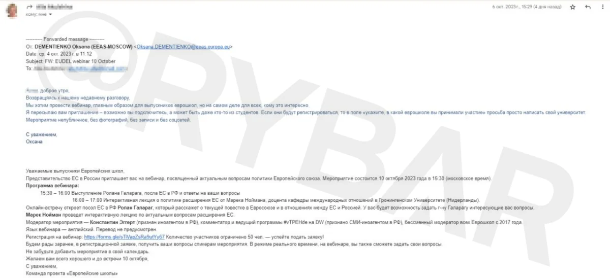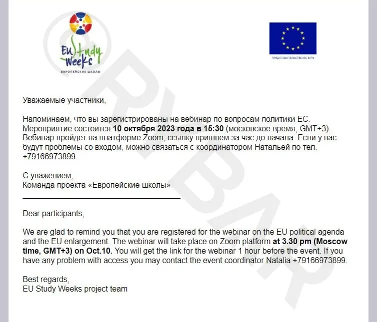 В частности, представители ЕС воспользовались контактом в Воронежском государственном университете, через сотрудницу которого пытались привлечь аудиторию для организации явно пропагандистского семинара. Приглашения на встречу рассылались выпускникам проекта «Европейские школы», который реализует представительство ЕС в РФ.