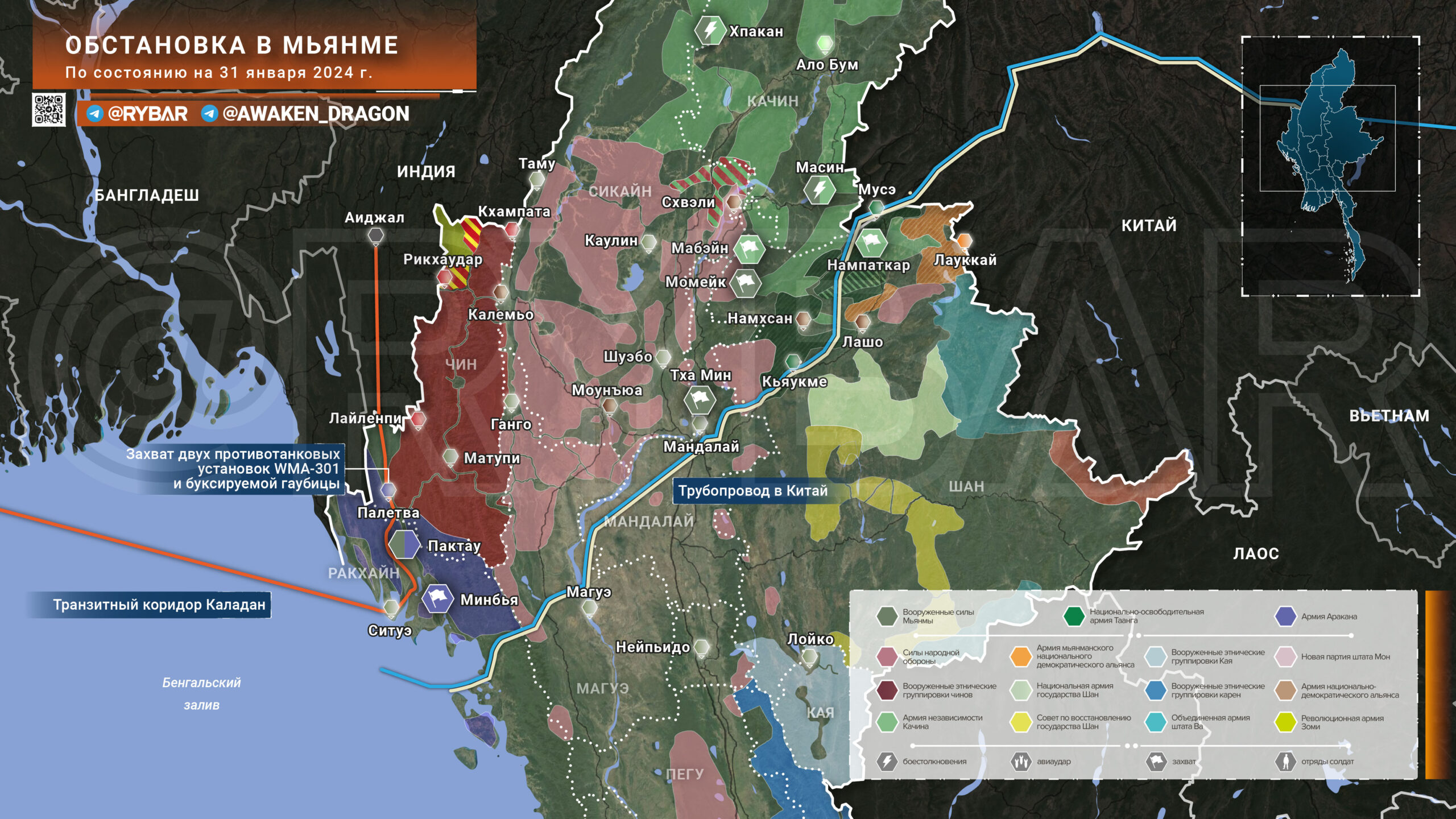 В штате Ракхайн подразделения «Армии Аракана» (АА) после успехов на нескольких участках заняли новый населенный пункт. На этот раз под контроль араканцев перешла Минбья. Также практически сошло на нет сопротивление правительственных сил в Пактау. Небольшие очаги контроля армии всё ещё есть, но при сохранении тех же темпов его переход под контроль АА — это вопрос времени. О важности Ракхайна мы говорили ранее, поэтому араканцы сосредоточены на этой провинции. Их успехам также поспособствовал захват склада вооружений в Палетве — боевикам достались китайские противотанковые установки WMA-301 и буксируемые гаубицы.