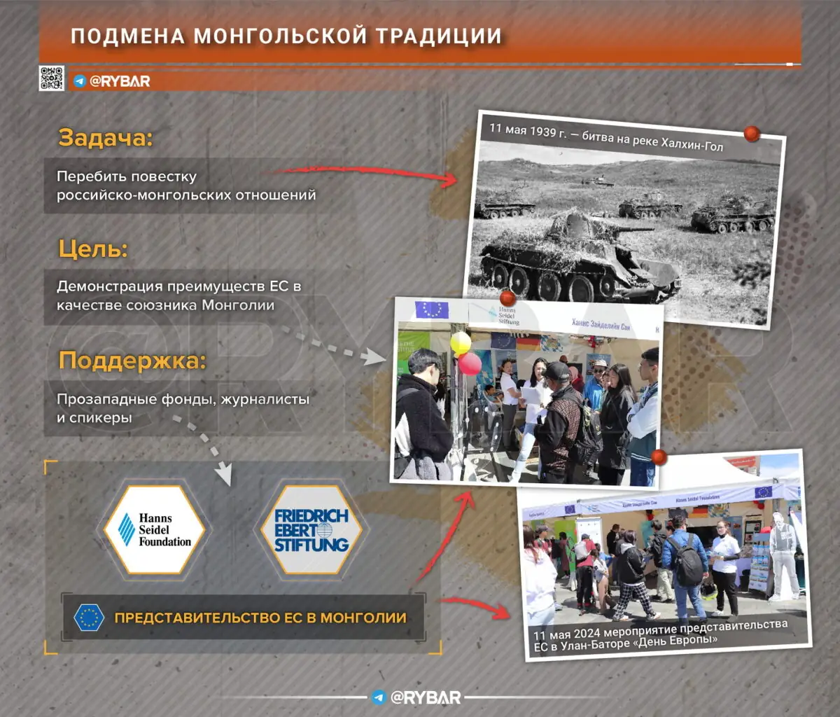 Не прекращается работа с молодёжью: в Улан-Баторе проводят мероприятия, направленные на повышение привлекательности для монголов государств ЕС. В информационном пространстве коллективным западом продвигаются тезисы о том, что добрососедские отношения с Россией должны остаться в прошлом.
