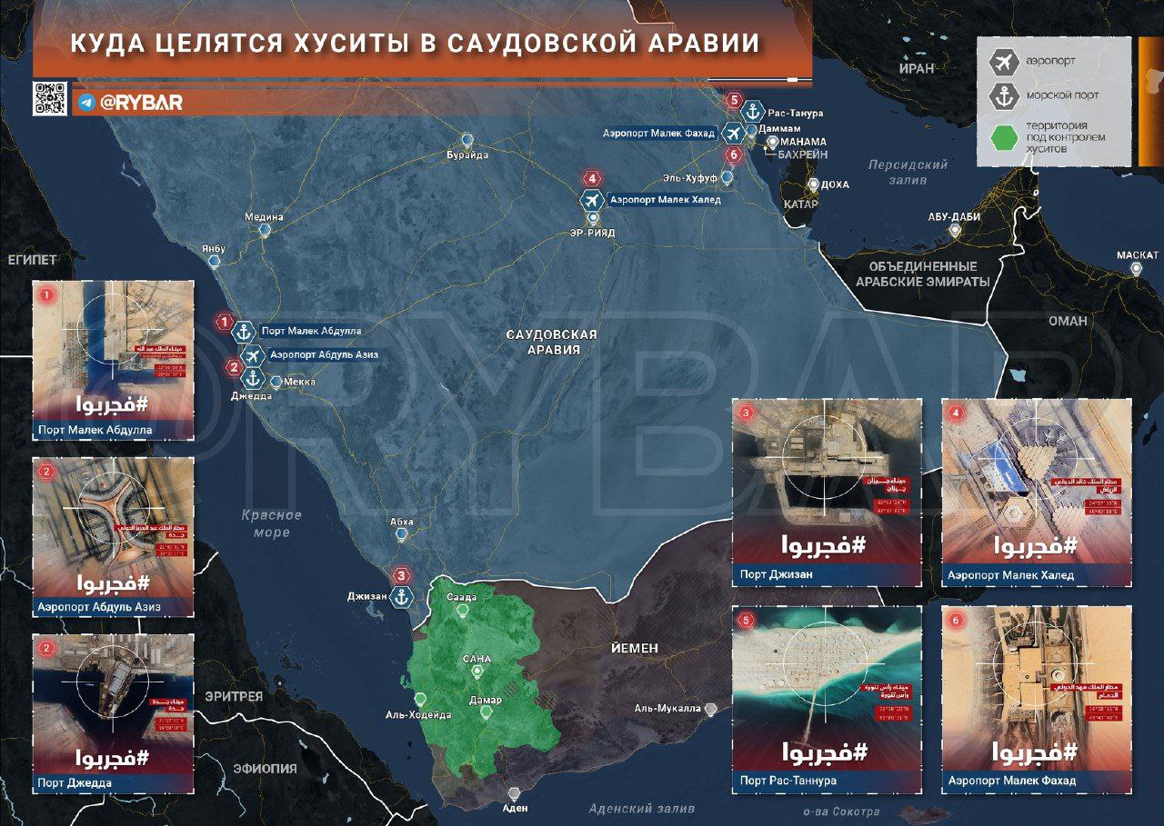 Судя по красивым картинкам из пресс-службы «Ансараллы», хуситы нацелены на три аэропорта и четыре порта в разных частях Саудовской Аравии: три из них — в западной части, четыре — в восточной части страны.