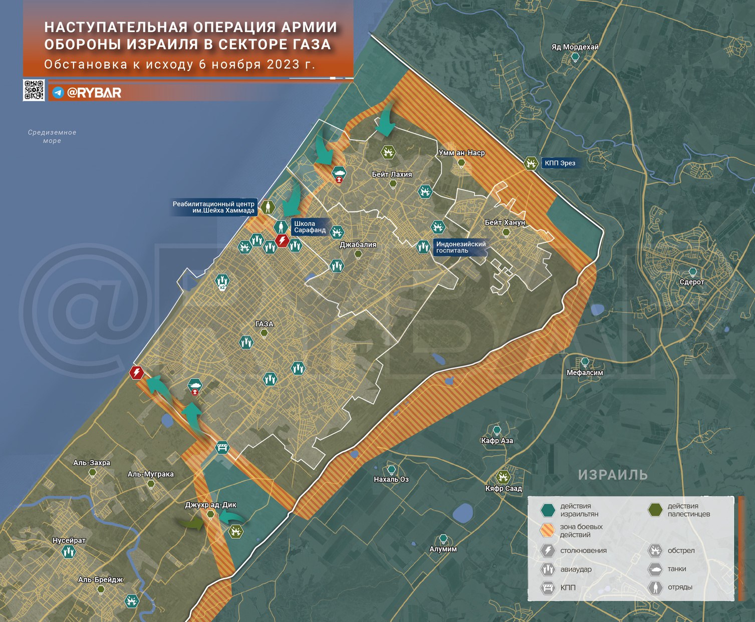 Подразделения Армии обороны Израиля продолжают медленно продвигаться в городской застройке на севере сектора Газа. На северном фронте идут бои на окраинах районов Аш-Шати и Шейх Радван. Произраильские каналы опубликовали кадры с солдатами АОИ в школе Сарафанд, располагающейся в этом районе.