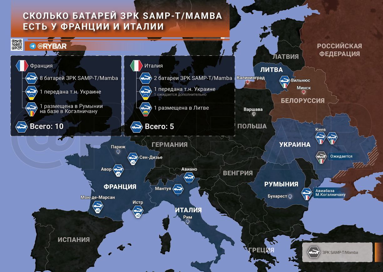 Напомним, что французы передали т.н.Украине одну батарею французских «Мамба», а итальянцы – одну батарею SAMP-T. Еще одну они пообещали осенью прошлого года, но она пока так и остается для прикрытия войск в Кувейте.