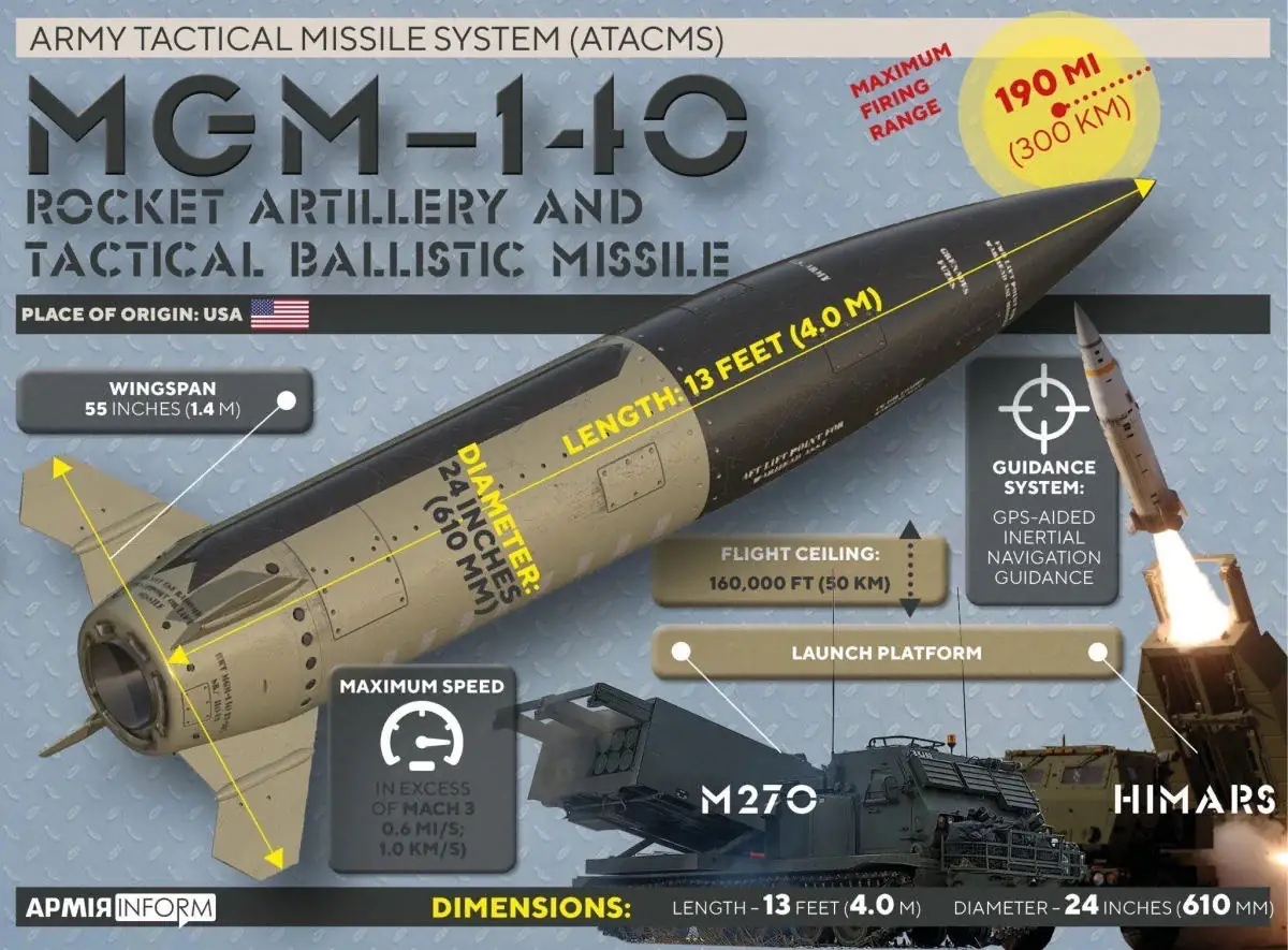 ATACMS сокращение от Army Tactical Missile System (армейский тактический ракетный комплекс) предназначен для высокоточного поражения особо важных целей, расположенных в глубине обороны противника: командные пункты (групповая, площадная цель), пусковые установки ракет (групповая, площадная цель), обьекты ПВО (одиночная или групповая цель), узлы связи (одиночная и групповая цель), склады ГСМ (площадная, групповая цель), в любых погодных условиях и любое время суток.