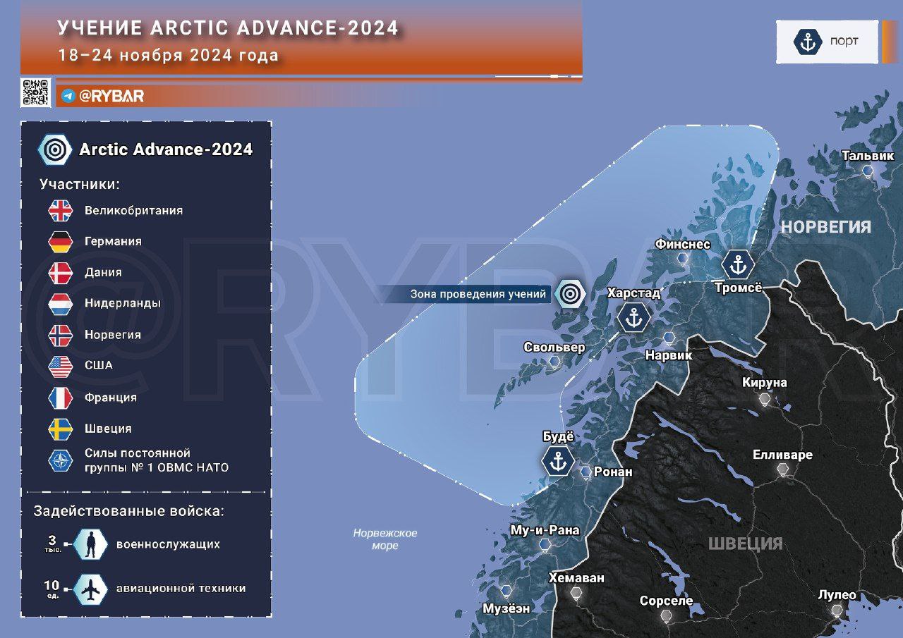 Только мы рассказали об активности НАТО в Балтийском море, как сегодня началось еще одно учение в Норвежском море под названием Arctic Advance, и продлится оно до 24 ноября.