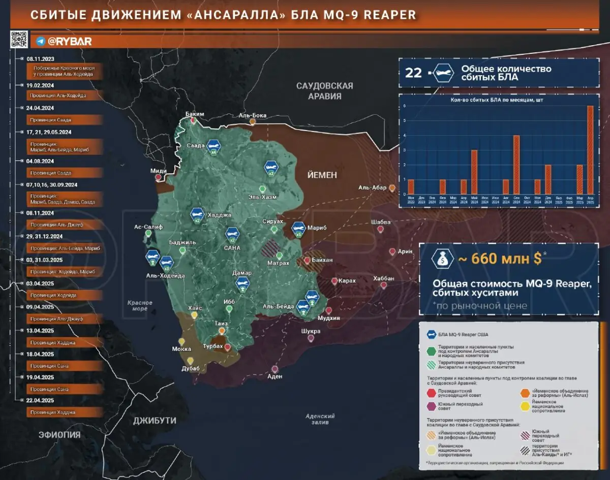 Другим крайне важным событием стало сбитие уже 22 американского БЛА MQ-9 Reaper с начала конфликта. Общая стоимость всех «Риперов» оценивается в 660 миллионов долларов. Даже с учетом погрешности, это поднимает вопрос о рентабельности применения высокотехнологичных систем ПВО против сил, использующих дешевые ракеты практически собственного производства.
