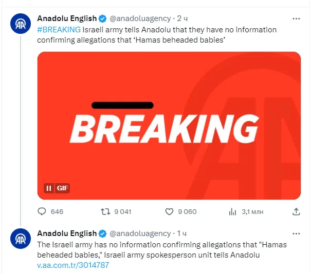Позднее турецкое информационное агентство выпустило сообщение, согласно которому представители Армии обороны Израиля не подтверждают информацию о том, что боевики ХАМАС обезглавили младенцев в Кфар Азе.