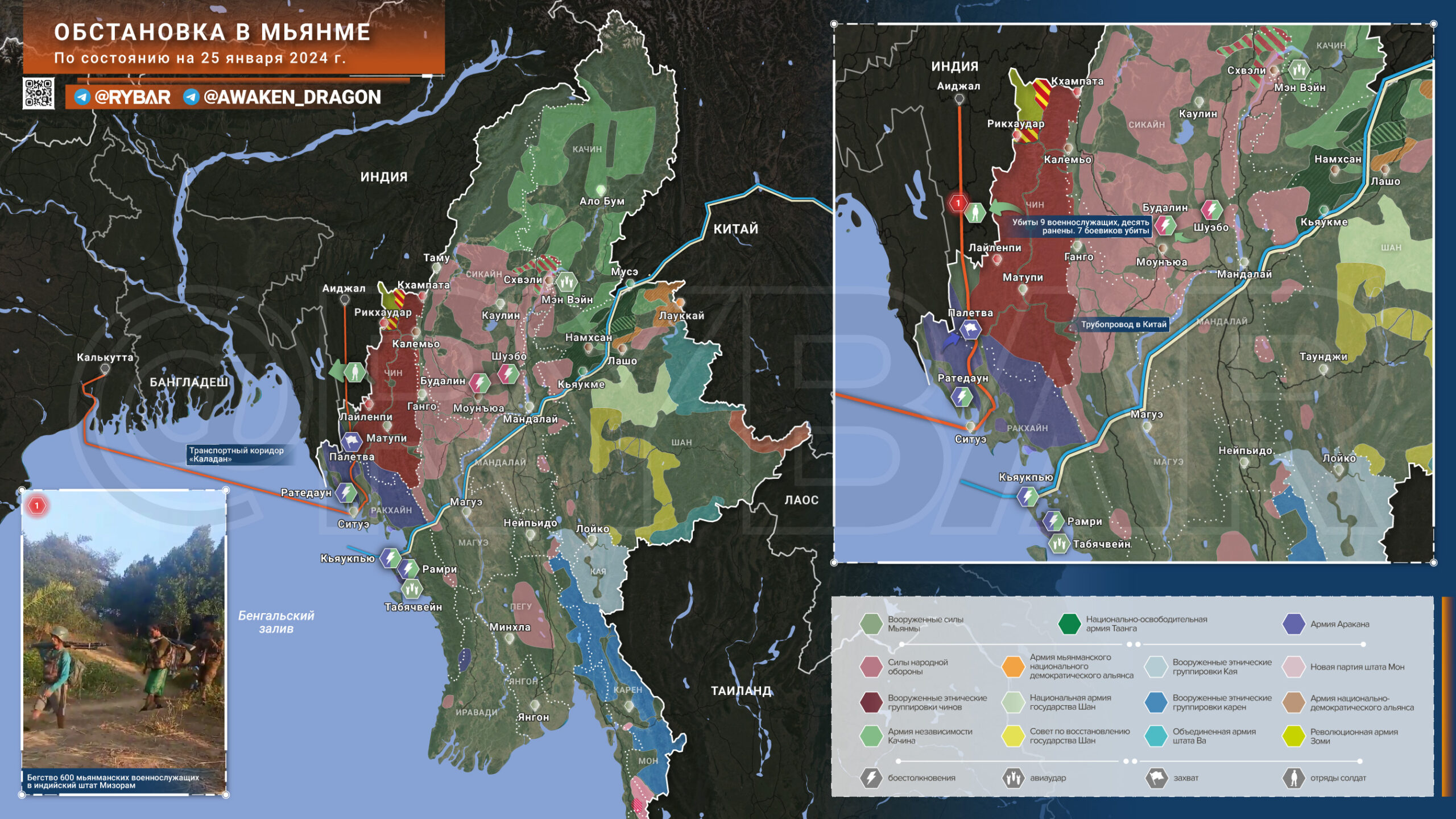 После боев в штате Шан эпицентр событий резко перенёсся на северо-запад — в штаты Ракхайн, Чин и область Сикайн, где действуют подразделения «Армии Аракана» (АА), которая является членом «Альянса», и этногруппы чинов. На днях силы АА атаковали позиции ВС Мьянмы в Ратедауне, Рамри, а Палетва в штате Чин и вовсе перешла под контроль араканцев — тогда 600 военнослужащих сбежали в Индию.