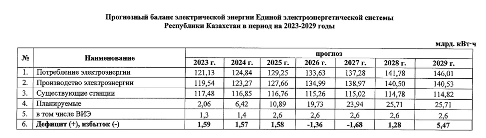 Министерство энергетики Казахстана выложило на своем сайте интересный документ «Об утверждении прогнозных балансов электрической энергии и мощности на 2023-2029 годы». Согласно ему, дефицит электроэнергии в энергосистеме в 2026 году сменится избытком, но к 2028 он вновь вернется, только в еще больших масштабах.