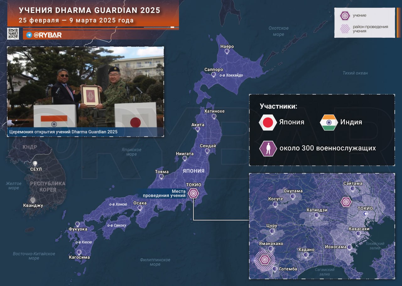 Союзники по блоку QUAD продолжают наращивать взаимодействие. Около 300 военнослужащих из Японии и Индии сейчас проводят учения Dharma Guardian 2025 неподалеку от Токио.