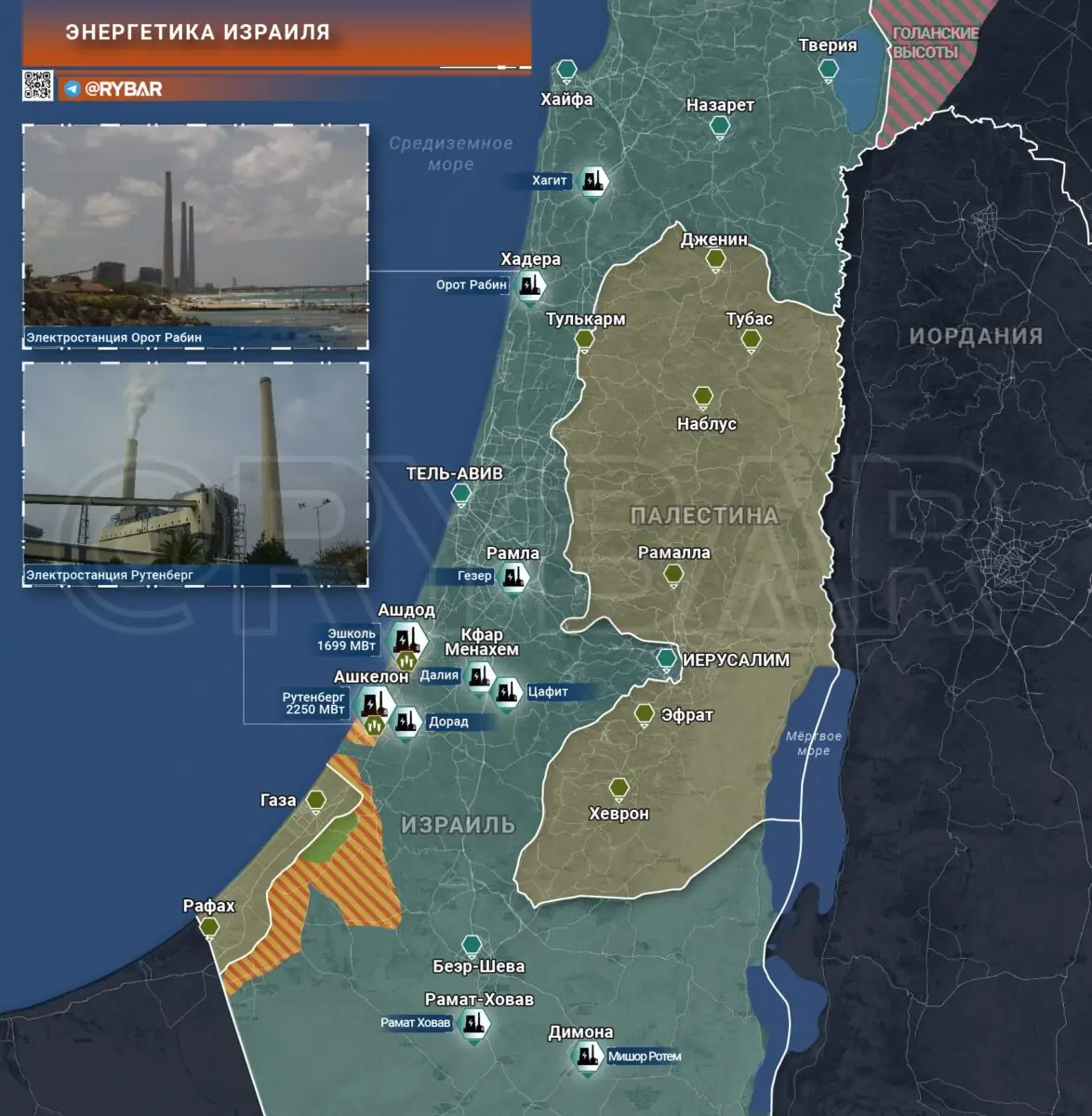 На текущий момент повреждения получили угольная станция Рутенберг 2250 МВт в Ашкелоне и электростанция на мазуте Эшколь 1699 МВт в Ашдоде. При их совокупном объеме генерации, энергосистема Израиля уже потеряла 27,3% объема мощностей, если объекты выведены из строя полностью.