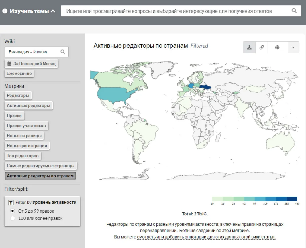 Редакторы российской Википедии по странам