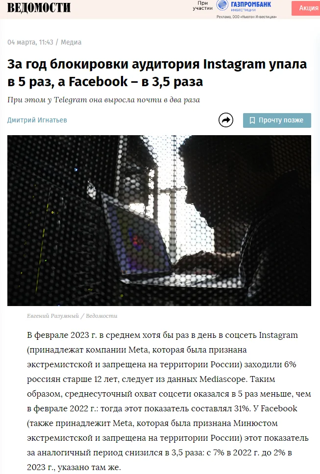 По данным Mediascope, за год после блокировки Instagram охваты соцсети снизились в 5 раз.