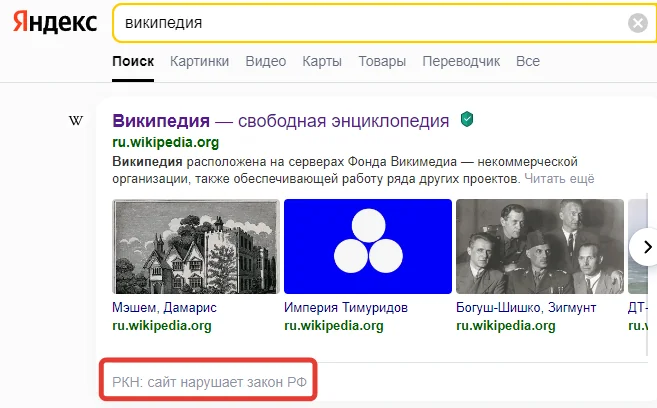 Еще более нелепо выглядит то, что РКН заставил российские поисковики писать о нарушении Википедией законодательства РФ — теперь, если вы в «Яндексе» найдете какую-либо статью, то там будет висеть плашечка о том, что сервис нарушает законодательство РФ. Какую реакцию это должно было вызвать у руководителей платформы, кроме унизительного смеха, остается только догадываться.