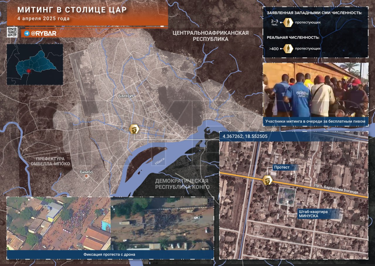 Протест был организован миссией ООН в ЦАР, что особо и не стали скрывать — шествия прошли прямо у штаб-квартиры «миротворцев» МИНУСКА. Кстати говоря, именно у неё пытались завлечь народ бесплатным пивом.