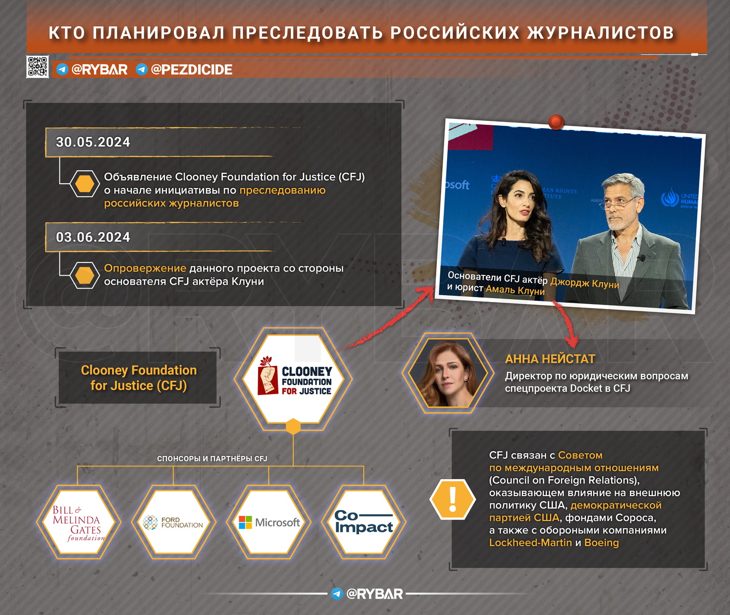 На днях стало известно, что «Фонд Клуни за справедливость» (Clooney Foundation for Justice, CFJ) будет добиваться в разных странах возбуждения уголовных дел и выдачи ордеров на арест российских журналистов, общественных деятелей и блогеров, являющихся, по версии CFJ, «пропагандистами войны и геноцида».