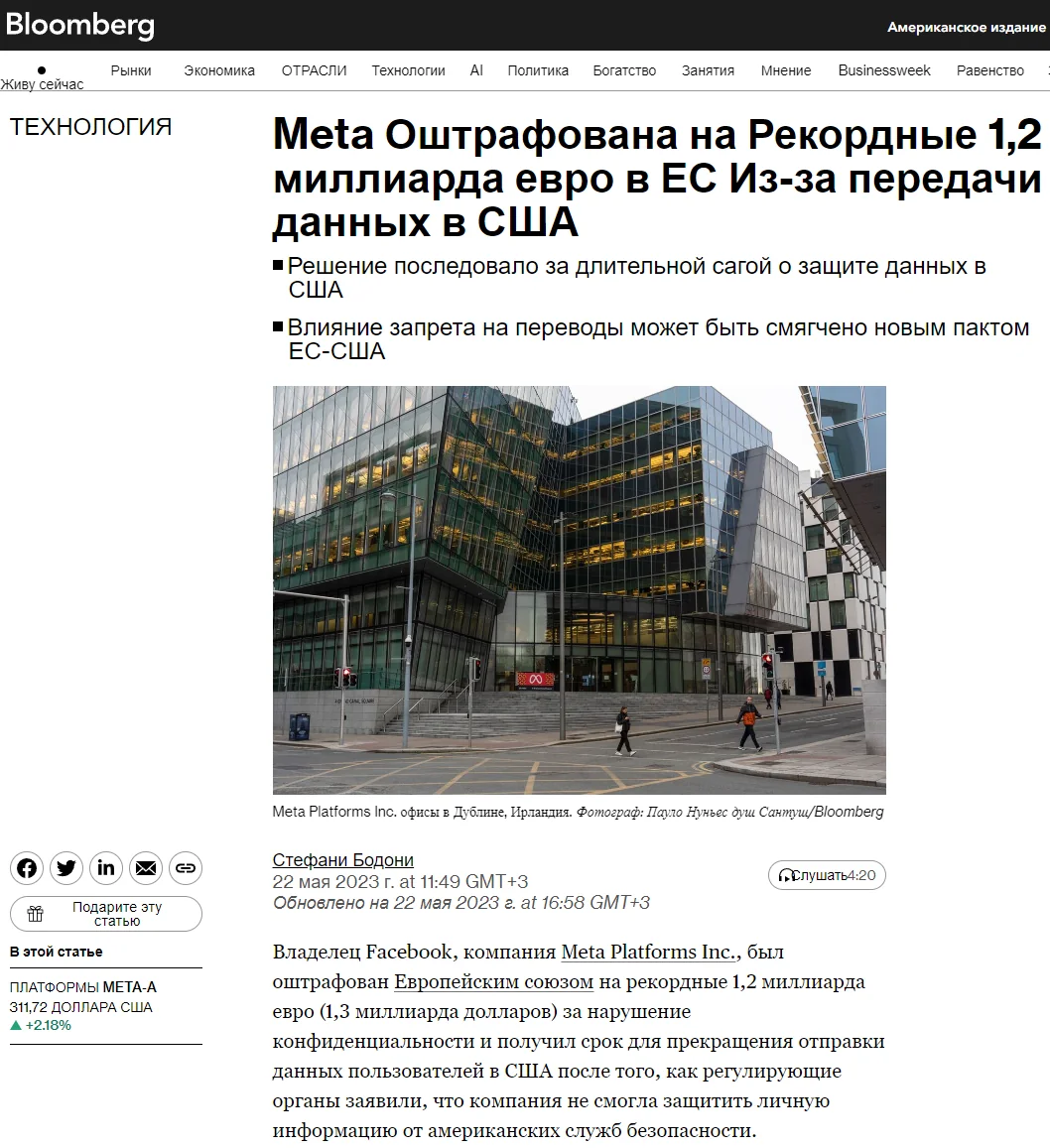 Занятно, что конфликты на этой почве возникают даже с ближайшими союзниками: в мае этого года Европейский Союз оштрафовал владеющую WhatsApp Meta на 1,2 миллиарда евро за передачу персональных данных в США. При этом одной из причин в ЕС назвали то, что корпорация не может защитить данные от американских служб безопасности.