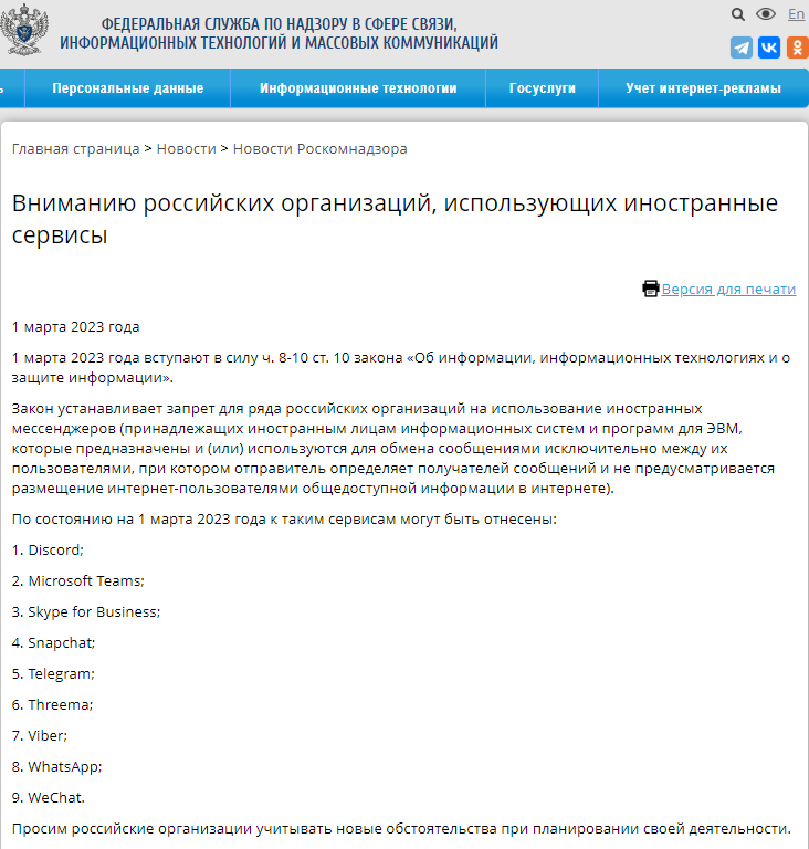 Директива Роскомнадзора о запрете пользоваться иностранными мессенджерами в работе отдельных российских организаций
